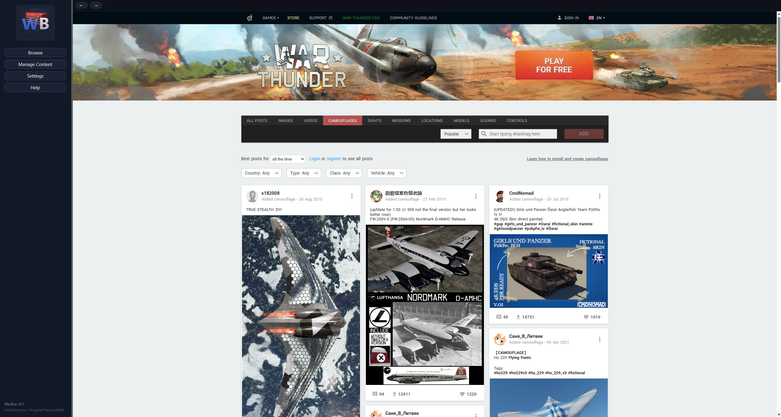 Instead of downloading ZIP files, digging through folders, and manually moving things around, WarBox lets you browse skins directly from the War Thunder Live site and installs them into the correct UserSkins folder automatically.